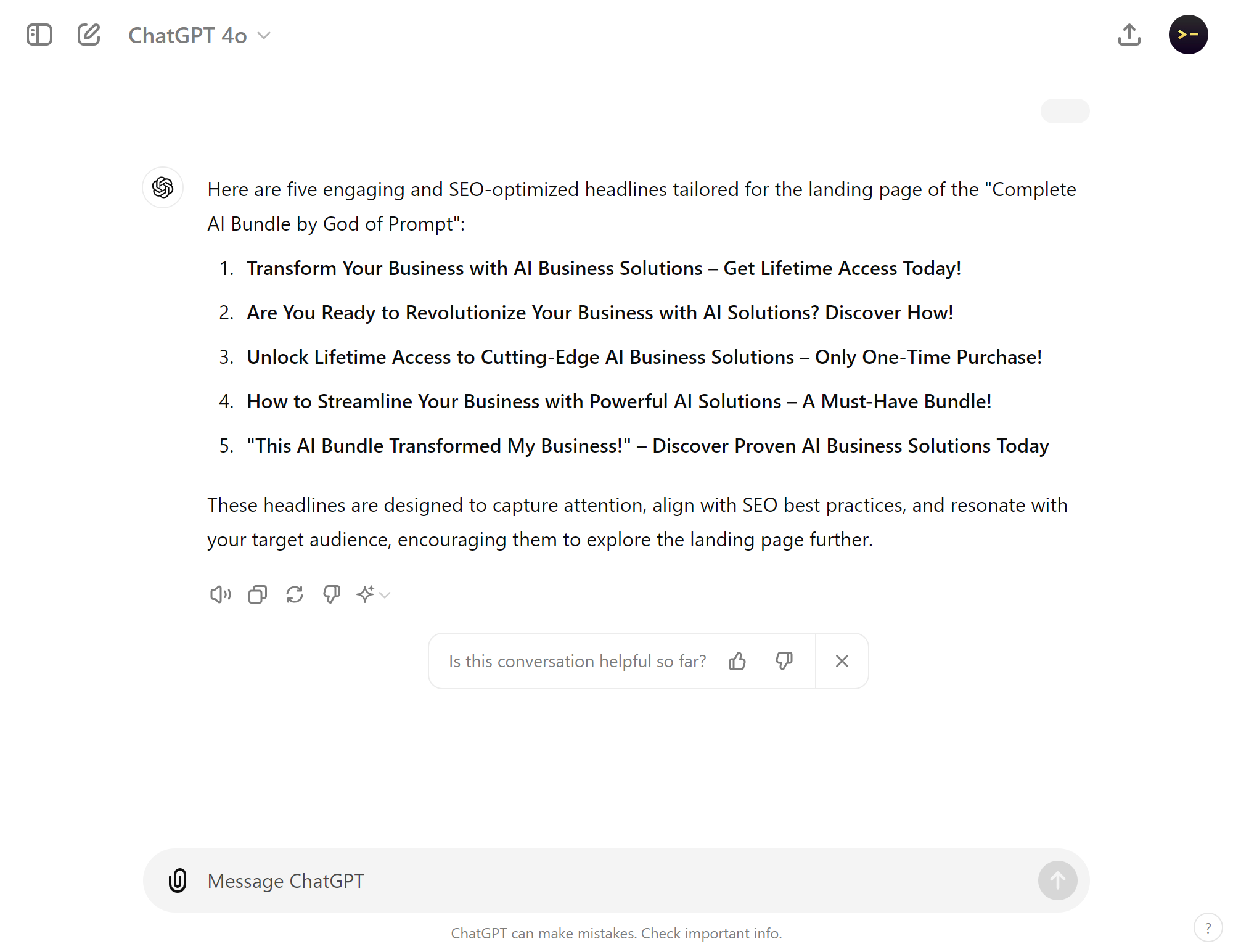 ● Generates five engaging and SEO-optimized headlines for a specific type of webpage.