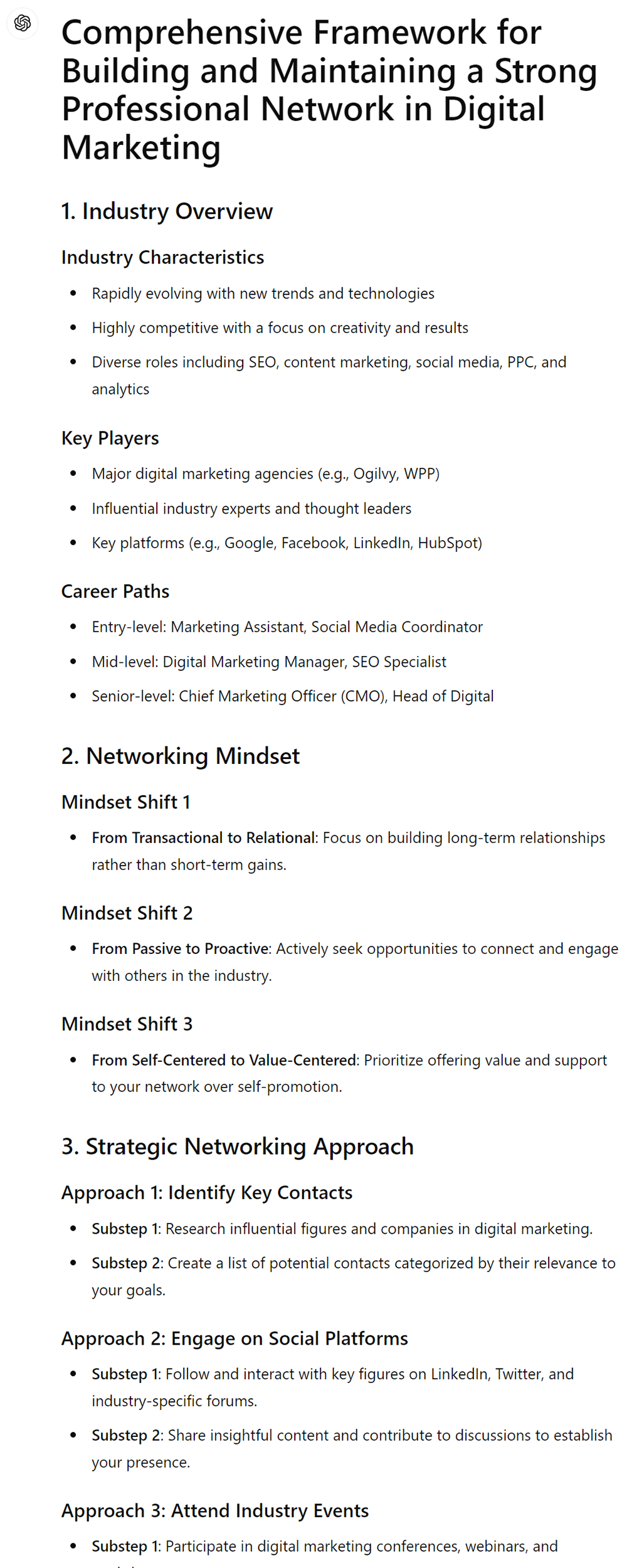 ● Use this tailored information to generate a comprehensive networking framework that is specific to your industry, ensuring all advice and strategies are relevant and actionable.
