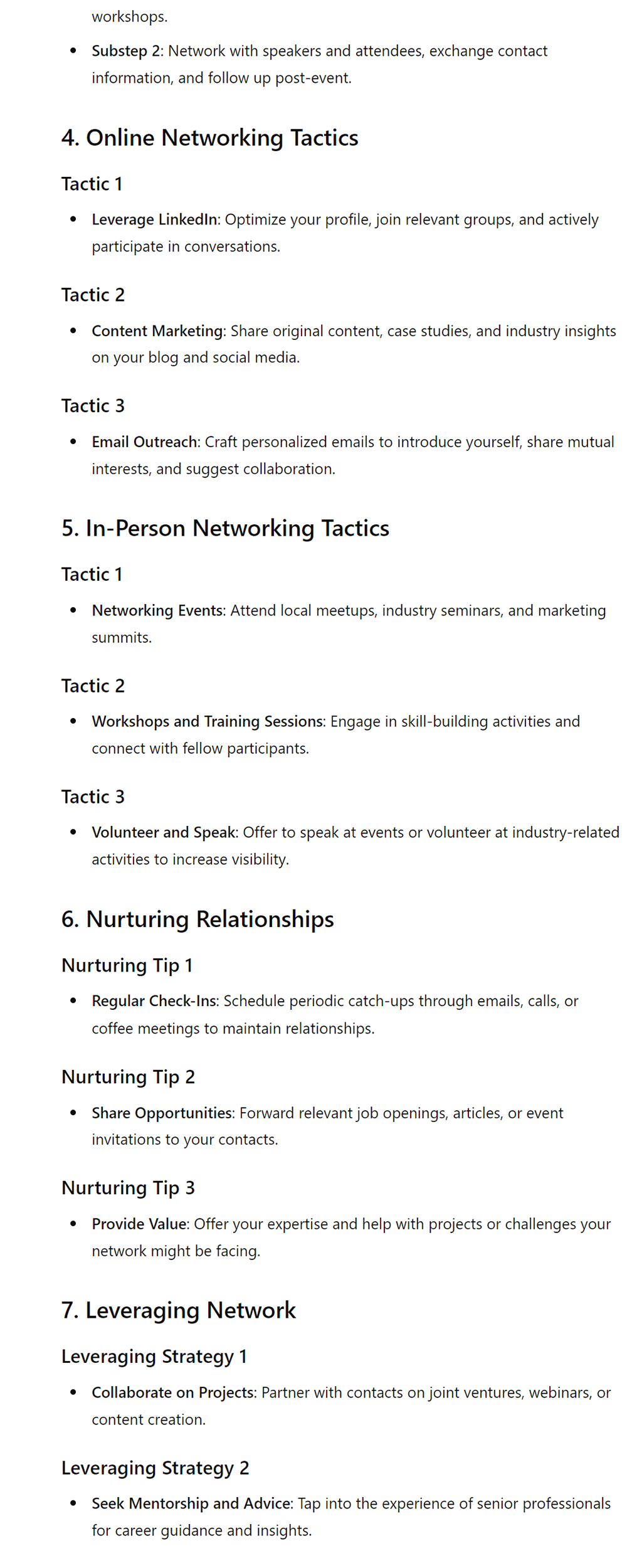 ● In the “Leveraging Network” section, advise users to leverage their network by offering assistance and support to others, as well as seeking opportunities to collaborate and share resources, fostering a mutually beneficial relationship.