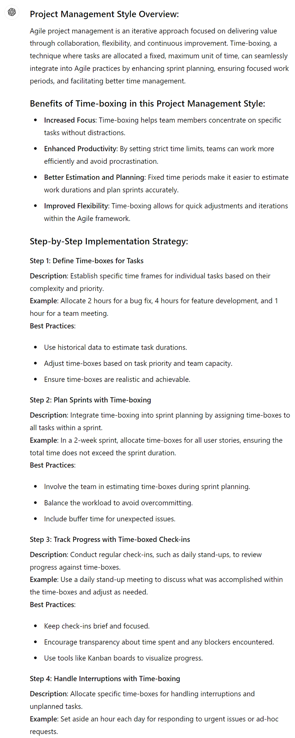 ● Example: If your project management style is “Agile,” then replace [INSERT PROJECT MANAGEMENT STYLE] with “Agile.” This will tailor the strategy specifically to Agile methodologies, integrating time-boxing effectively within that context.